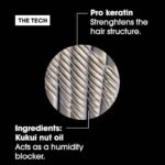 • Has Hydrolyzed Keratin to create a protective barrier around the hair cuticles from external environmental factors.